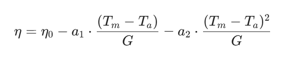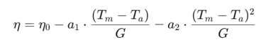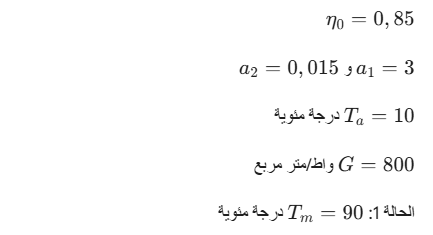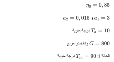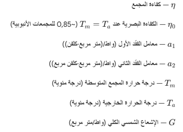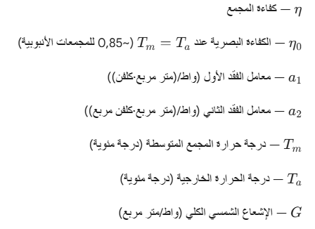 تفقد المجمعات الشمسية الحرارية كفاءتها كلما ارتفعت درجة حرارة التشغيل المتوسطة لناقل الحرارة Tm مقارنة بالهواء المحيط Ta.
